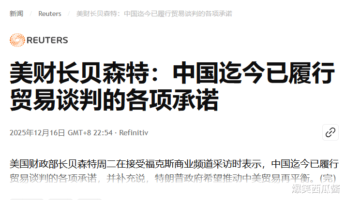 2025年12月中旬,特朗普政府的“钱袋子”管家、美国财政部长斯科特·贝森特,在镜头前罕见地给出了好评。他明确表示:“到目前为止,中国履行了谈判达成的所有承诺。”甚至还颇为“贴心”地建议,双方可以达成一个非常好的贸易均衡。