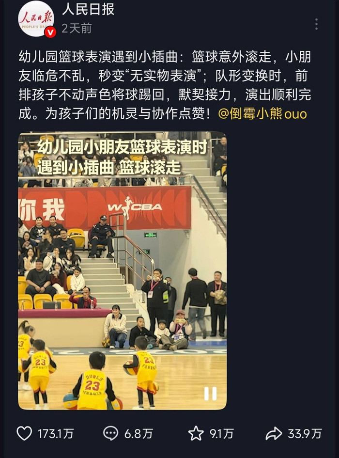 近日,一段幼儿园小朋友在WCBA女篮比赛中场表演篮球操的视频,在抖音平台获得了超百万个点赞,并被人民日报、央视新闻等多家权威媒体转载。